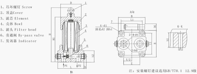 该过滤器设有压差发讯器装置,当滤芯污染堵塞到进出油口压差为0.35MPa时,即发出开关信号,此时更换滤芯,以达到保护系统安全的目的。